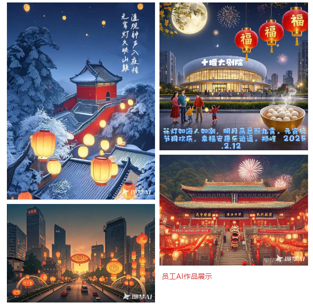 十堰分部在办公室举办“元宵共庆,欢乐团圆”主题活动,以手工制作和AI工具展开,通过亲手制作兔子灯和金鱼灯,增强了员工的动手能力和团队协作能力。同时,为跟进人工智能技术的快速发展,鼓励员工熟悉和快速适应AI工具,十堰分部还组织员工结合十堰市地标建筑用AI工具制作元宵节祝福画作,青年员工们大显身手,制作出各种精美的节日画作,丰富了员工的业余生活,提高了员工工作积极性和创造力,营造了和谐的工作氛围,让每位员工都能感受到节日的欢乐和团圆的氛围。